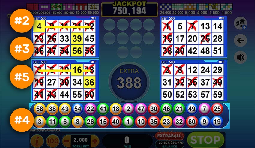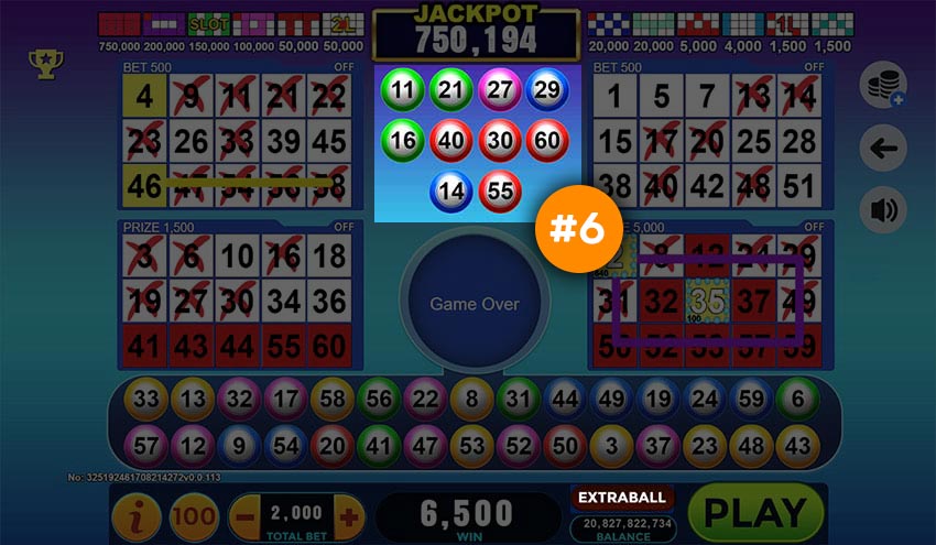 #6. Ahora se pone interesante, mire los patrones de pago y los patrones potenciales que están “casi” completos. En la mayoría de los casos, se le dará la oportunidad de comprar hasta 10 bolas adicionales para ayudarlo a completar los patrones ganadores.